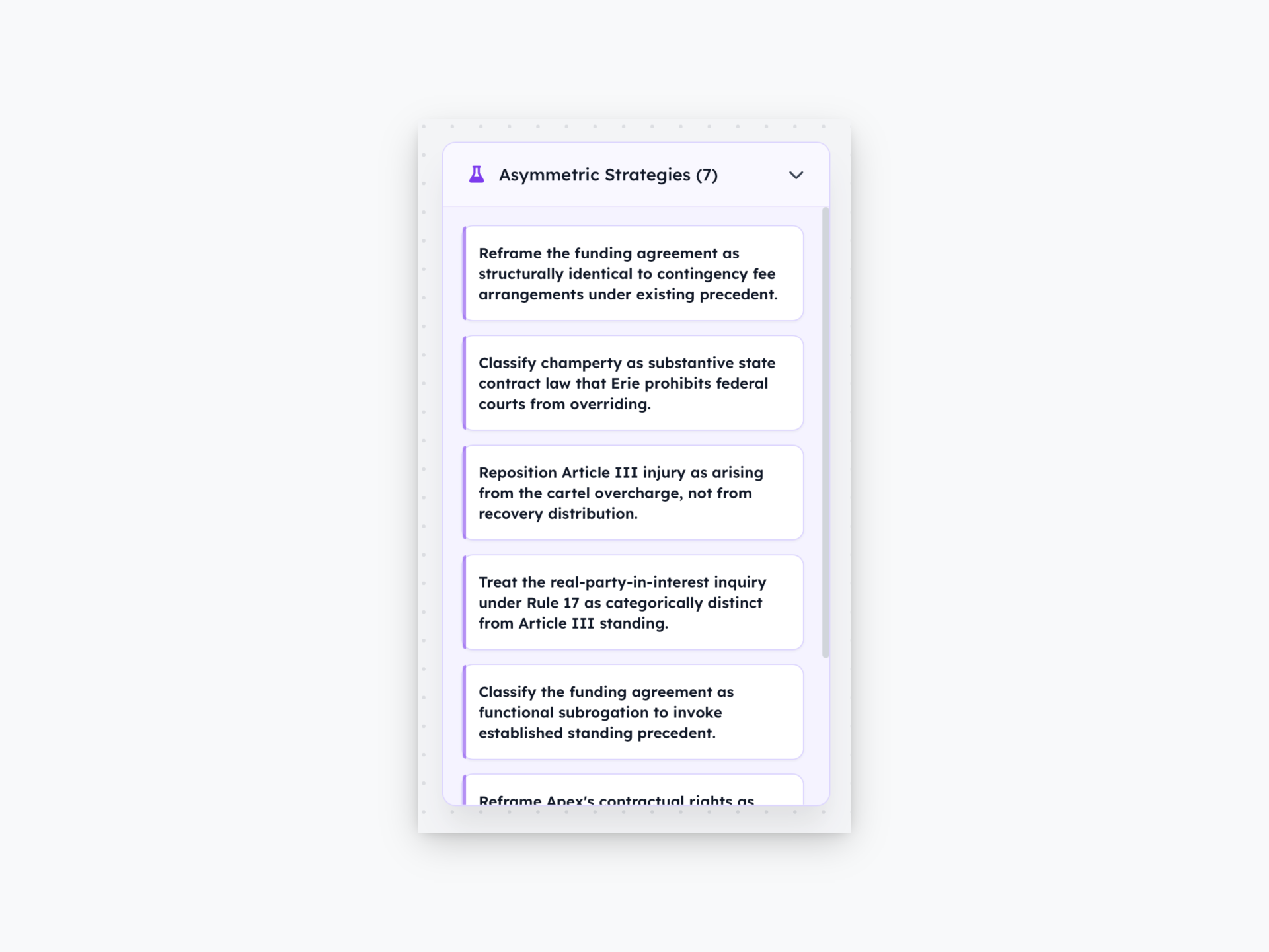 - Feasibility assessment. The system evaluates resulting strategies for doctrinal coherence and practical viability; final filtering rests with human counsel.